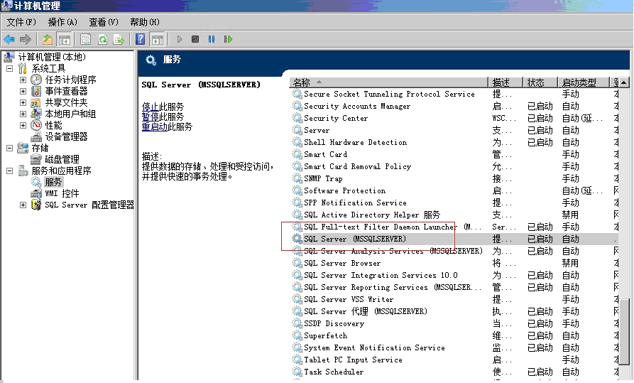 打開“管理”在“服務(wù)”中選擇“SQL Server (MSSQLSERVER)”右鍵屬性選擇“登錄”如下圖: